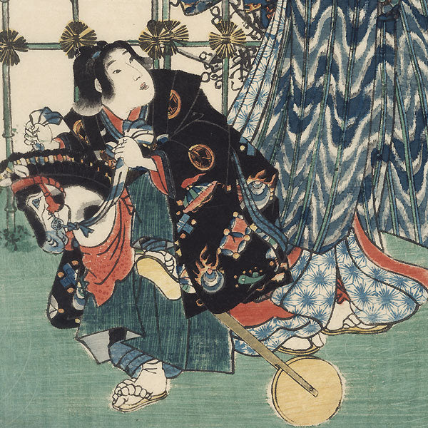 Comments - Lovely triptych illustrating a scene from the first month of the year. Three beauties and a young boy are gathered in a garden beneath ancient plum trees covered with white buds and blossoms. The child rides a toy hobby horse, smiling back over his shoulder as he grips the striped reins. The elegantly dressed beauty at right can't help smiling at his enthusiasm, hiding her mouth behind her kimono sleeve as she giggles. Her robe is patterned with chrysanthemum blossoms, the flowing sleeves trimmed with tasseled bows. Her hair is adorned with clusters of blue flowers and hairpins with dangling bells. The woman in the center claps her hands with delight, while the beauty at left carries the young prince's sword upright. She wears a gray-green kimono with a design of gourds and vines, tied with a dragon obi. The Boston Museum of Fine Arts has this image in its collection. A charming design, beautifully detailed.